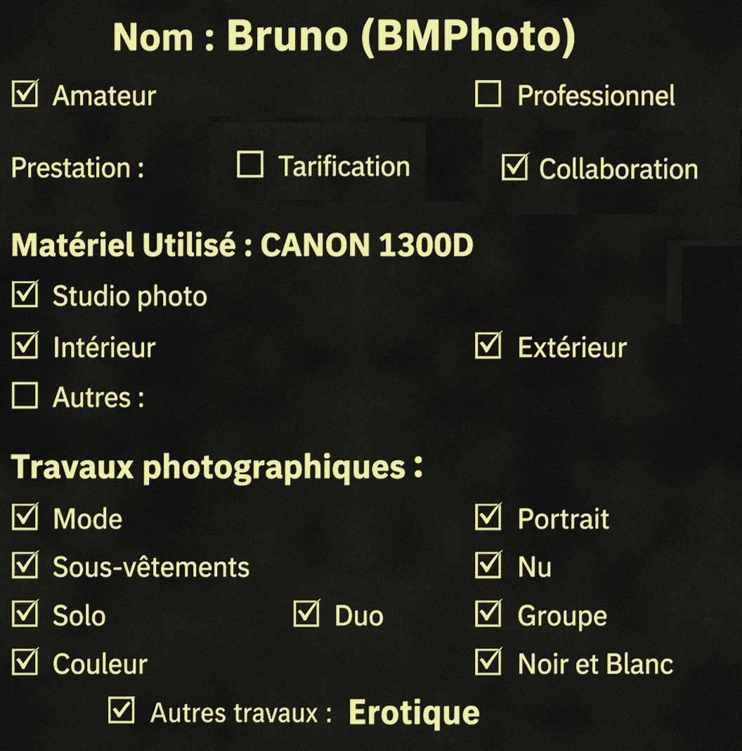 👀 Pour découvrir mes réalisations en tant que photographe, cliquez sur la rubrique RÉALISATIONS DE BMPHOTO et si vous souhaitez me découvrir en tant que modèle, allez dans la rubrique BMMODÈLE (depuis un smartphone, cliquez sur MENU en haut de cette page pour afficher les rubriques).